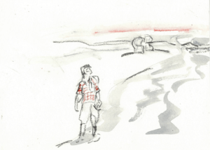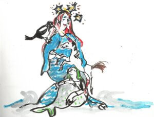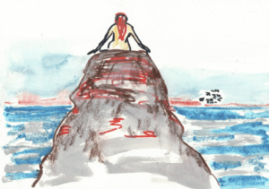 Stattdessen kam aber eine Frau den Strand entlanggeschritten, ja, sie schritt. In der Hand hatte sie einen kleinen Hammer mit einem spitzen Ende und einen Rucksack auf dem Rücken. Im Näherkommen entledigte sie sich ihrer sportlichen Bekleidung und setzte sich neben die erfreute Göttin.