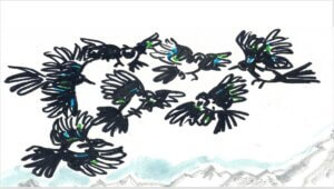 Bald bezogen Micha und ihr Team ein Bergschlosz im Sellrain, nahe den Ötztaler Alpen. Der Glanz ihres Gewandes und ihrer Persönlichkeit strahlte und lockte BesucherInnen aus aller Welt an. Eines Tages kam ein Schwarm Elstern angeflattert. Keckernd und Schackernd stellten sie sich als eine Abordnung vor, die sich in Micha eine Fürsprecherin erhofften. Den klugen Rabenvögeln mit den irisierend grünen und blauen Federn im Kleid wurde allerhand Unsinniges und vor allem Ehrabschneidendes unterstellt. Dasz einigen Orts davon ausgegangen wurde, die schwarz-weisz-bunten Allesfresser könnten sich in Menschen verwandeln, zweifelten die Tiere nicht an. Entschieden vorgehen wollten sie aber mit Unterstützung der Funkelnden Göttin gegen die Mär, Elstern seien „diebisch“ und sie hätten es besonders auf metallisch-glänzendes abgesehen, das sie entwendeten, um damit ihre Nester zu verschönern.