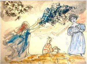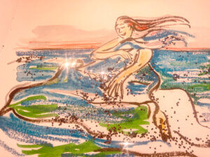 Micha setzte sich auf die Mauer zum Tal, griff in die Luft nach einer Schere und schnitt einen Hand-breiten Saum von ihrem Meeresglitzer-Kleid ab. „Hier, Lou, gibt das bitte den Frauen in Mexiko. Sie sollen es in eine Wasserschale geben – und innerhalb von einer Nacht wird der Stoff sich verhundertfacht haben. Und jedes abgetrennte Stück hat die Fähigkeit, das ebenfalls zu tun. Und niemals wird es ihnen an echtem Glitzer mangeln!“
